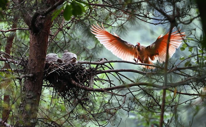 在陕西省洋县溢水镇老庄村一处朱鹮巢点,成鸟觅食归来。新华社记者 陶明 摄
