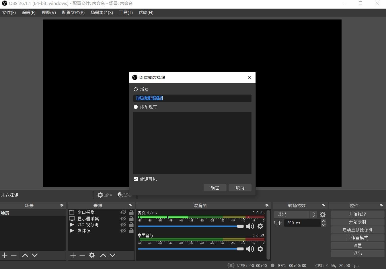 玩法一:推送本机摄像头视频流到服务器,局域网内所有人通过视频地址进行播放。1. 打开Obs,添加视频源,选择视频采集设备。