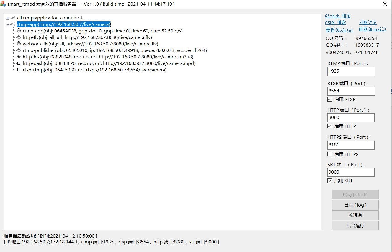 双击运行smart_rtmpd.exe程序并点击启动, 这时服务器会监听不同流媒体协议对应的端口, 接下来我们开始向服务器推流。推流是向流媒体服务器的rtmp端口进行推流,推流格式为: