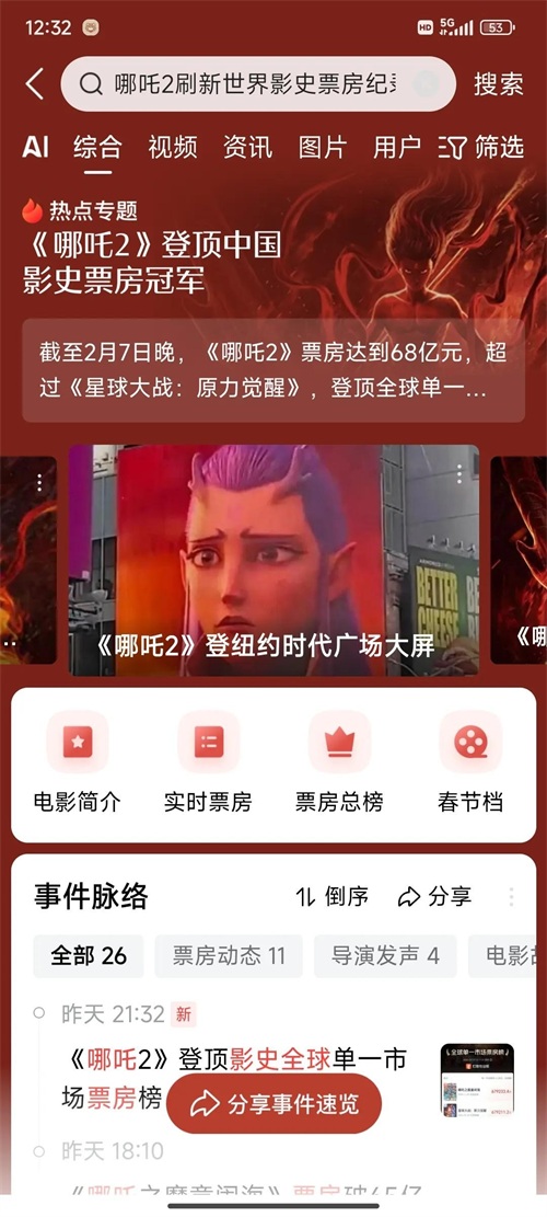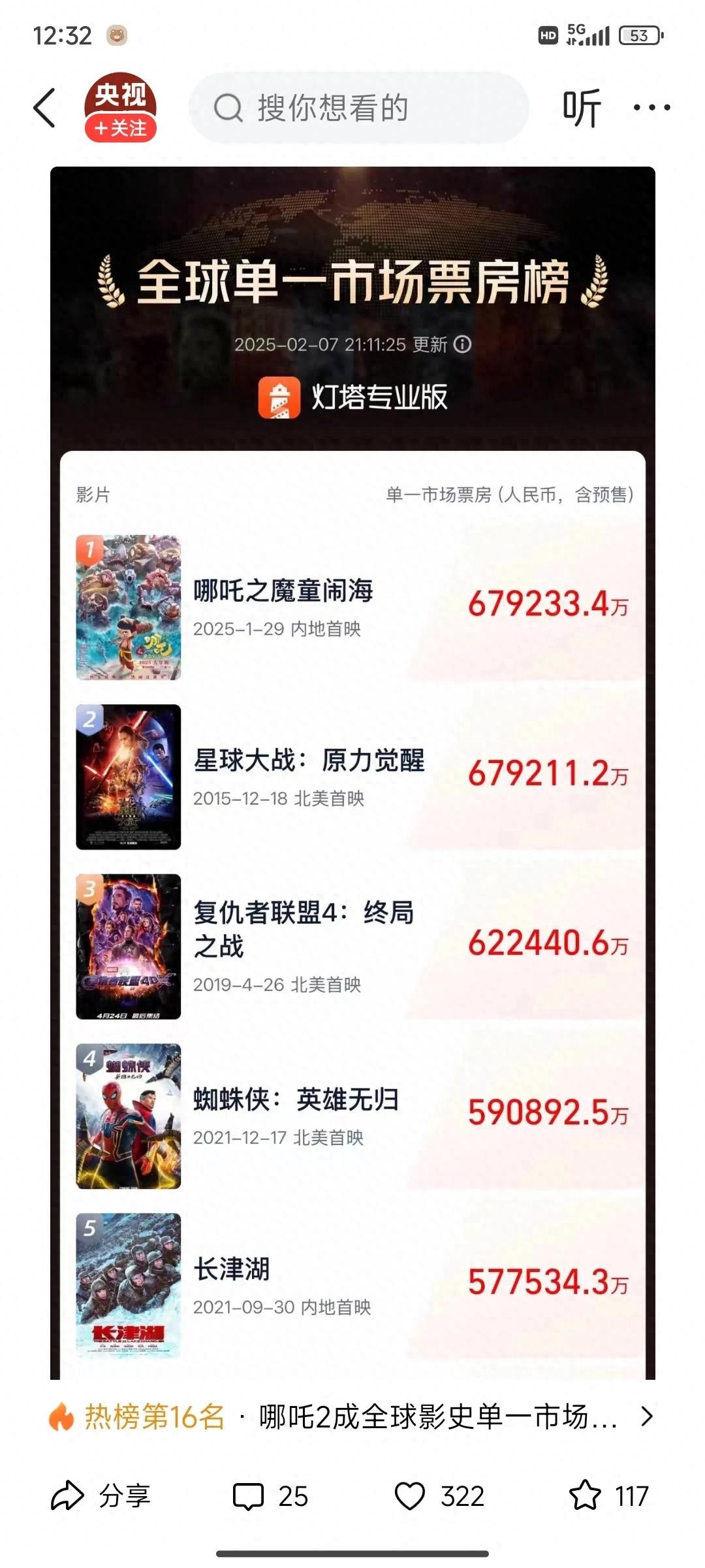 据网络平台数据,截至2月7日21时,电影《哪吒之魔童闹海》票房(含预售)突破67.922亿,超过《星球大战:原力觉醒》票房成绩,登顶全球影史单一市场票房榜!