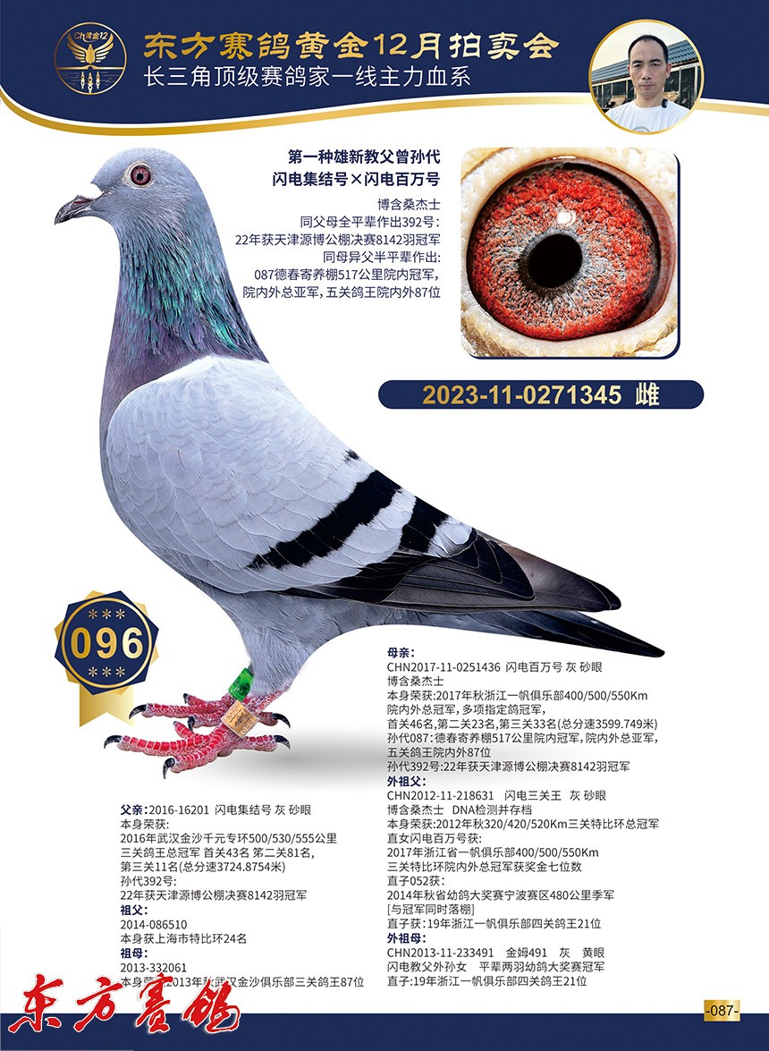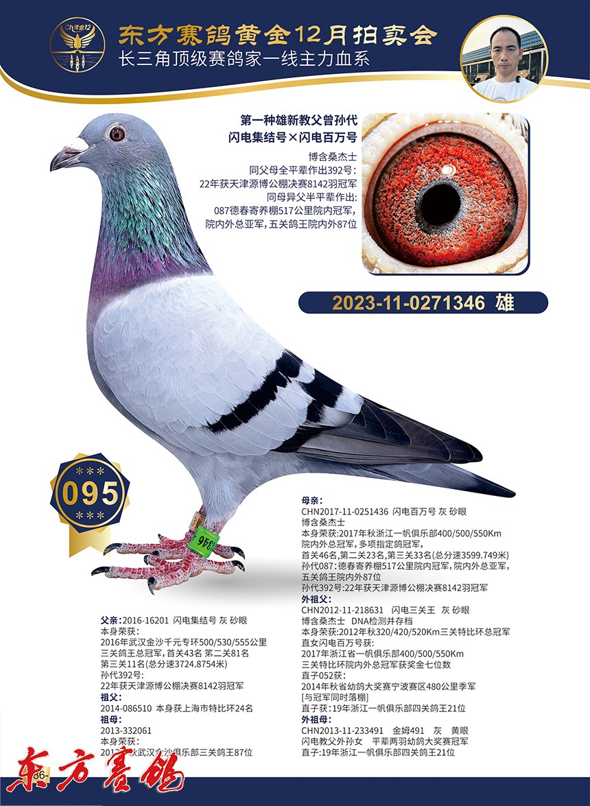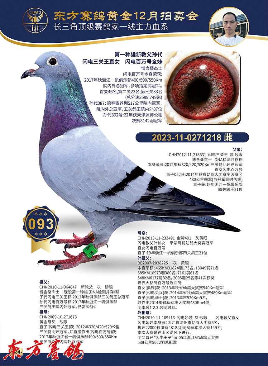 2004年,博含鸽舍有缘遇到一羽桑杰士的“闪电教父”,次年作出浙江省幼鸽大奖赛南路总冠军。之后,博含鸽舍19年专注一路“闪电教父”血脉,将其玩到极致,代代有冠军。