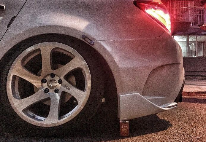 行走系统方面,改装了18寸3SDM轮毂,数据为前8.5j后9.5j,225胎做爆边,形成轮毂凸出轮胎效果,后轮做4度倾角,下雨天会打滑,要外观还是性能?在改装中,经常就是这样有舍有得的抉择中。