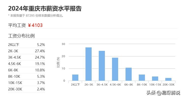 接下来带大家分析一下原因,请大家先看到这张2024年重庆薪资水平报告图,不要看平均工资4103,因为它是由87295份样本数据得出的,并不一定准确!只需看薪资分布比例即可,可以看到大部分人的工资水平集中在了2k-3k和3k-4.5k,这就占了整体的52.1%,所以感觉工资低,是很正常的现象,因为我们可能就处于这52.1%当中。