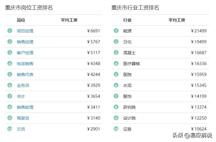 什么样的人平均薪资高啊?那还用说嘛,肯定是高层呗!接下来请大家再看左边的这张图,前三都是经理,薪资自然而然的高一些了,而后面的数据都很平均了,相差幅度不会超过300,右边的这张图,则是挣钱比较多的行业,第一个新能源,重庆新能源汽车的发展势头迅猛,就拿2024年上半年的数据来说,重庆汽车产量达到121.4万辆,在全国所有城市中位居第一。其他的就是医院、医疗器械、信息传输、软件和信息技术服务业以及金融业的平均工资会普遍较高,远超全市的平均水平,相比之下,一些传统行业或劳动密集型行业的薪资水平可能较低,比如服务员、清洁工等。