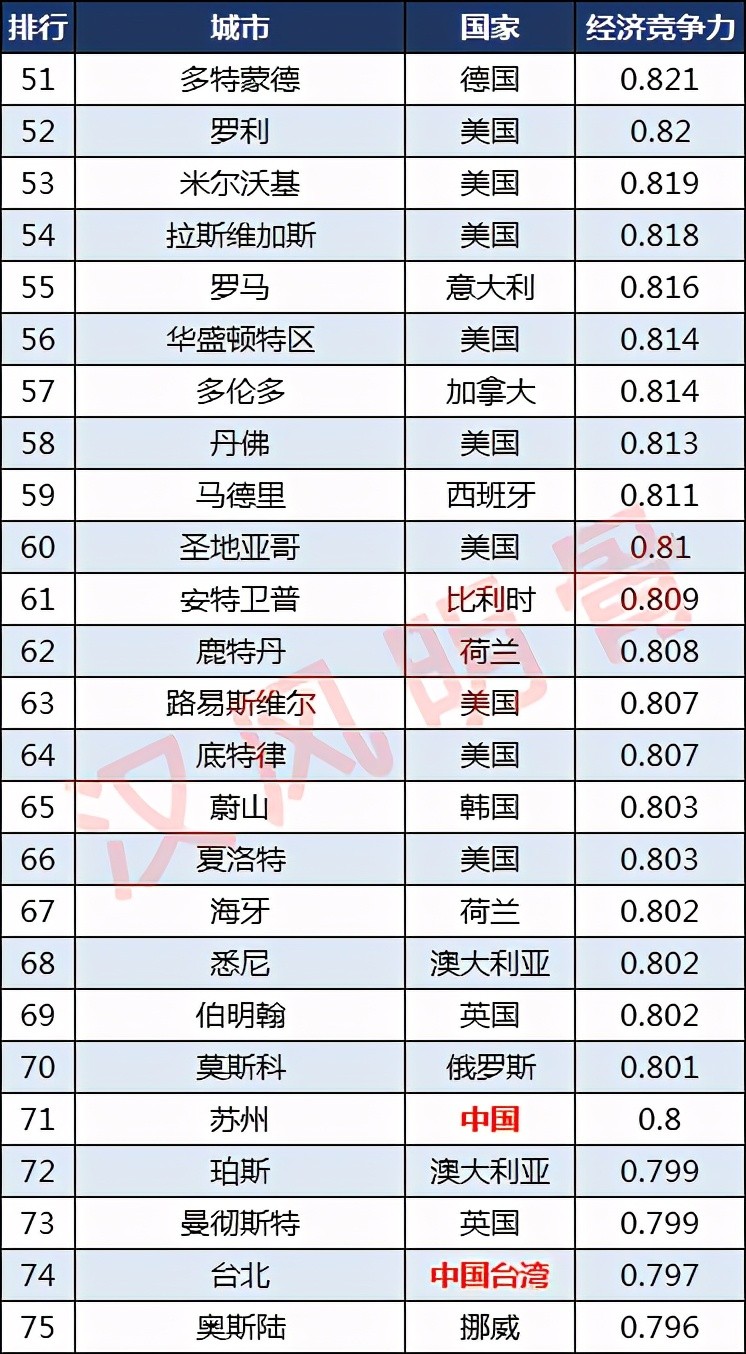 综合来看,全球经济竞争力100强城市中,有38座城市来自美国,11座城市来自德国,10座城市来自中国,美、德、中三国城市总数达到60座,考虑到各方面因素,也可以从侧面感觉到美国、德国两国的发达程度,毕竟城市经济竞争力只是经济社会发展的体现之一;