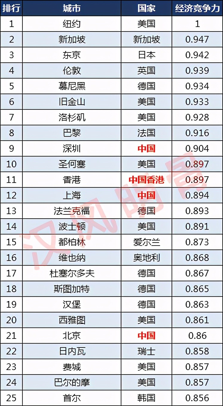 具体来看,纽约是世界上经济竞争力最强的城市,新加坡是世界经济竞争力第二强的城市,东京是世界经济竞争力第三强的城市,伦敦是世界经济竞争力第四强的城市;慕尼黑、旧金山、洛杉矶、巴黎、深圳、圣何塞也跻身世界经济竞争力十强城市,依次排名第五至第十。