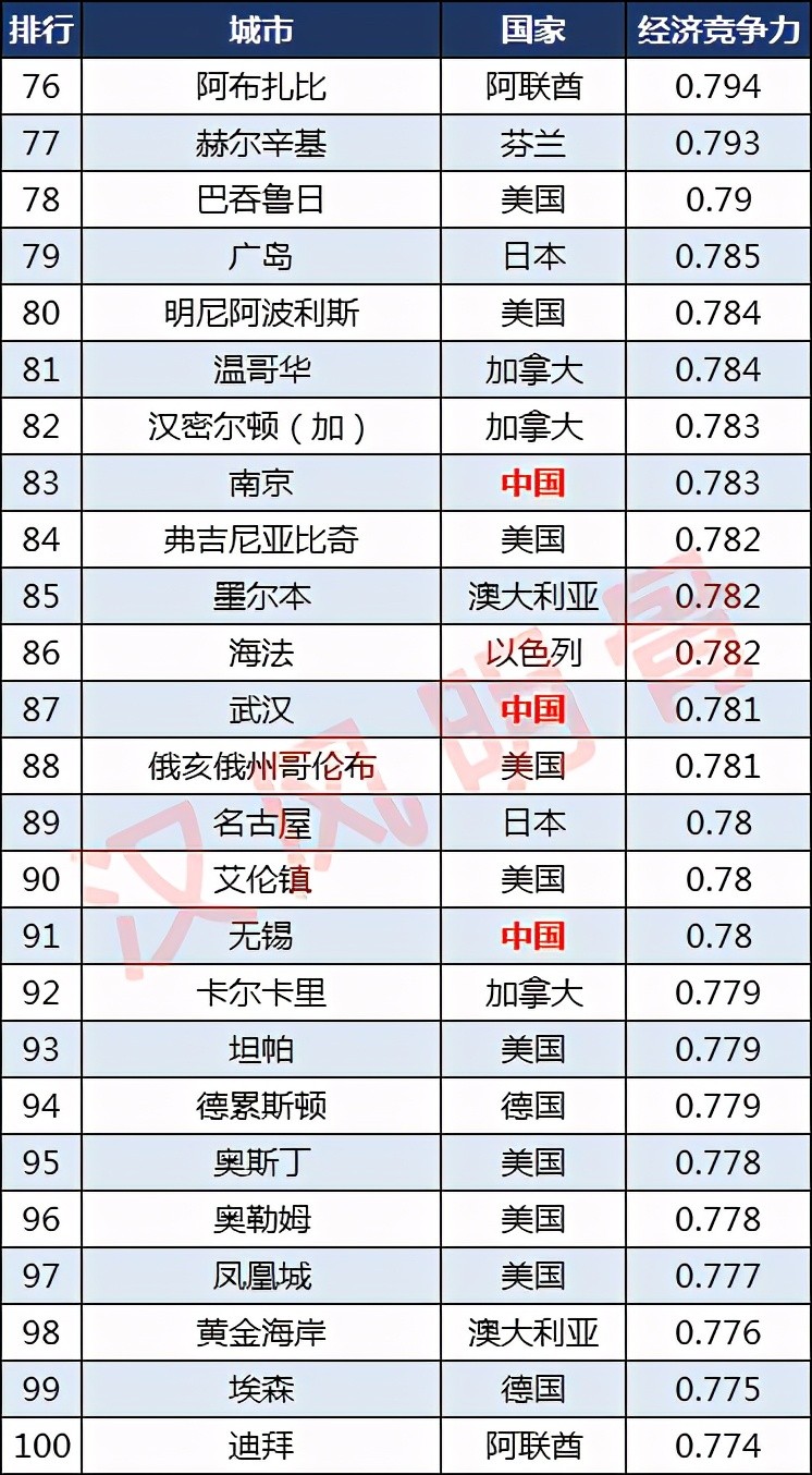 莫斯科排名第70,明尼阿波利斯排名第80,艾伦镇排名第90,迪拜排名第100。