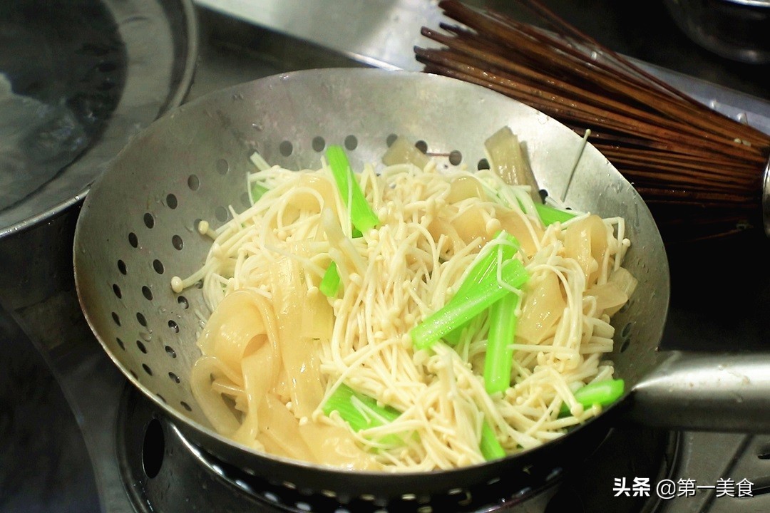 金针菇300克、把根切掉,川粉200克、放入盆中,芹菜两根、破开后切成小段,配菜的种类可以根据自己口味来选择。生姜一块、拍散后切成姜末,小米椒一小把、切成圈,必须放小米椒,成菜更加鲜辣,小葱几根、切成葱花,大蒜几粒、拍散后切成蒜末备用。
