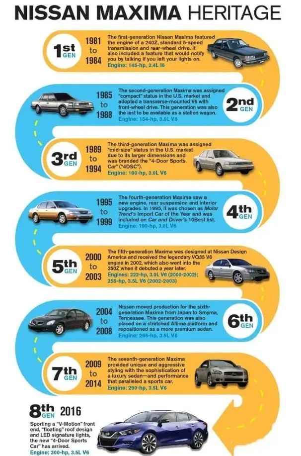第一代日产Maxima诞生于1981年(借助2.4升直列六缸发动机+后驱的设置,奠定了其它的运动属性)。第三代车型——第五代车型(1989年-2003年),日产Maxima销量逐年增高,成为美国市场家喻户晓的畅销车型。巅峰时期,该车售价曾高达80多万元人民币。从第七代车型开始,尤其是现款第八代车型,日产Maxima的销量便逐年降低(北美市场,2022年上半年仅售出3753辆,对比去年同期下降了62%以上)。