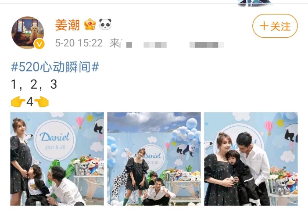 今年5月20日,姜潮又在社交平台上官宣了老婆怀二胎的喜讯。