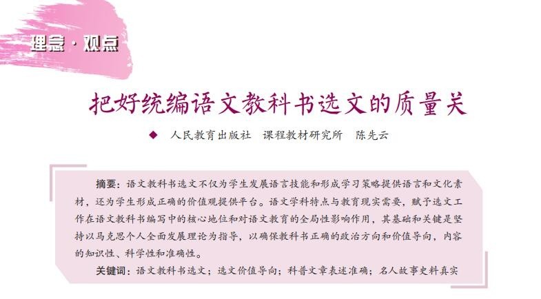11月15日,人民教育出版社微信公众号以《统编语文教科书如何选文?主编陈先云为你揭秘!》为题,转发了陈先云的这篇文章。陈先云的另一个身份是人民教育出版社课程教材研究所编审、研究员。