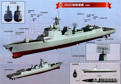 052D型驱逐舰是继德国萨克森级护卫舰、荷兰七省级护卫舰、丹麦伊万·休特菲尔德级护卫舰、日本秋月级驱逐舰、日向级直升机驱逐舰之后第六种配备四面有源相控阵雷达和通用垂直发射装置的军舰,这标志着中国从此拥有跻身世界先进行列的新锐防空舰。而越来越多的在建052D曝光, 使得中国成为拥有此型舰数量最多的国家。