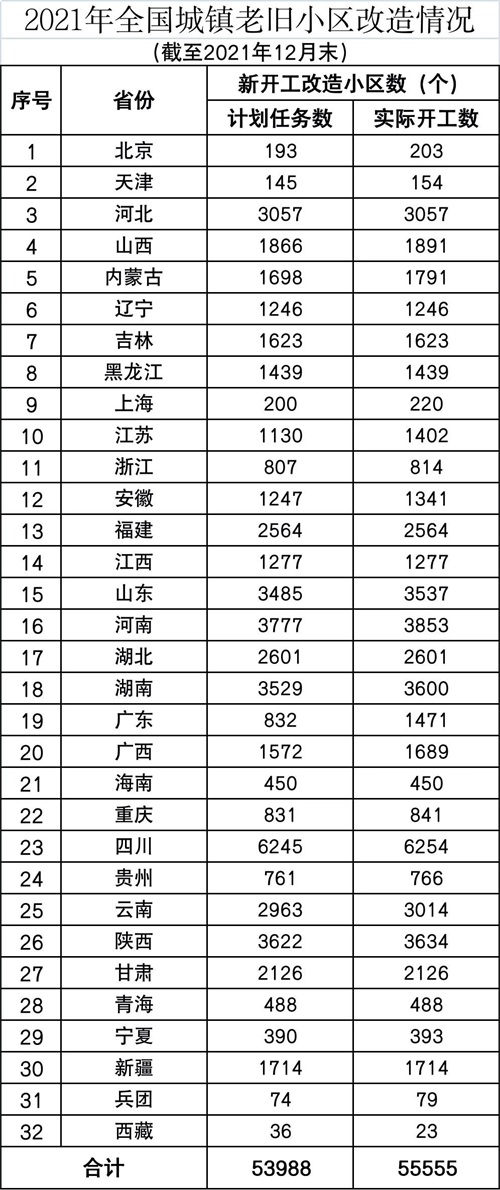 实际上,过去几年时间里,全国各地都在快速推进老旧小区微改造。2021年,全国计划新开工改造城镇老旧小区5.3万个,实际开工老旧小区改造为5.56万个,目标率达到102.9%。
