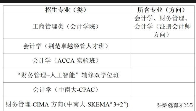 会计学院2024年本科招生按照大类招生和特色专业方向招生相结合的方式进行。其中,工商管理类(会计学院)按照大类招生,分流专业包括会计学、财务管理、会计学(注册会计师方向);会计学(荆楚卓越经管人才班)列入"希贤计划"高考单独招生;希贤计划会计学(ACCA实验班)、“财务管理+人工智能”辅修双学位班面向工商管理类(会计学院)大一新生入学后二次招生;会计学(中南大-CPAC)、财务管理-CIMA方向(中南大-SKEMA"3+2"")两个特色项目面向全校各专业在入学后进行二次招生。