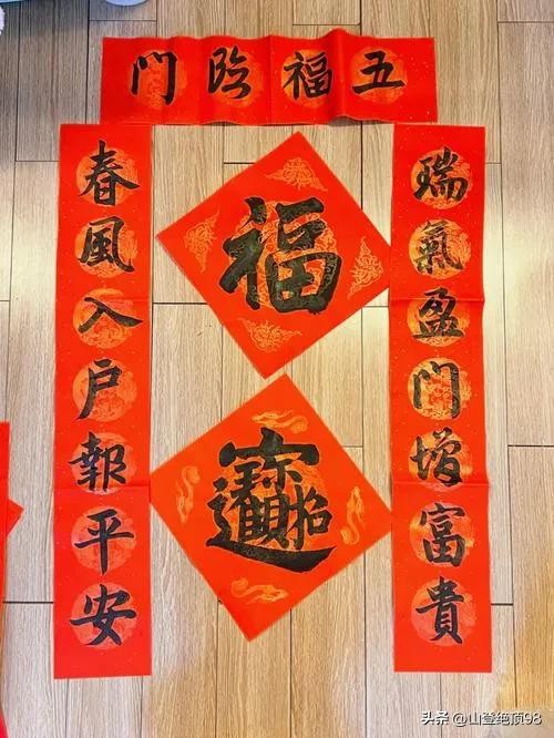 贴对联和福字:人们会在屋门、墙壁、门楣上贴对联和福字,以示迎接新年的到来。对联通常是对仗工整、韵律和谐的对句,而福字则代表着福气和好运。