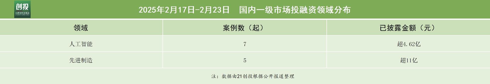 本周融资数量最多的行业领域仍是科技与制造。在三大行业领域的诸多赛道中,人工智能赛道完成7笔融资,披露的融资金额超4.62亿元人民币;先进制造赛道完成5笔融资,披露的融资额超11亿元人民币。