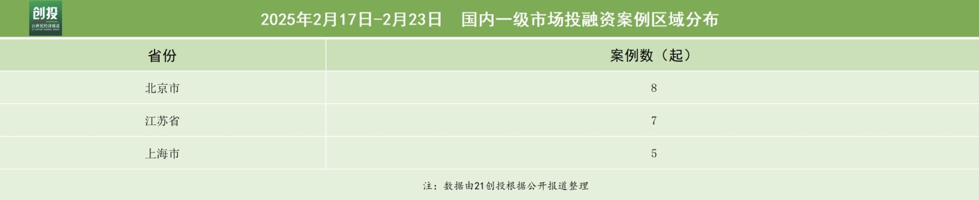 从披露获投企业的地域分布来看,本周的融资地区主要集中在北京市、江苏省、上海市,分别完成8笔、7笔、5笔融资。