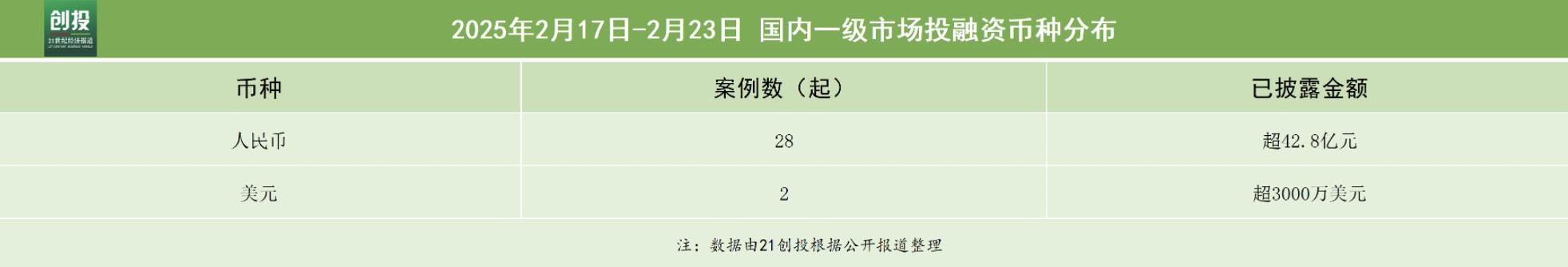 21创投不完全统计,2月17日—2月23日,报告日期内国内一级市场发生融资事件37起。其中,有30笔融资披露了融资金额和币种信息,总规模约合人民币44.97亿元。