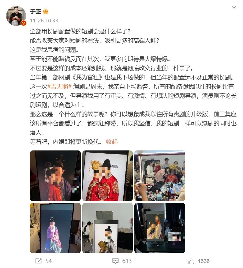 11月21日,影视制作人于正在微博公布了其高成本短剧《吉天照》的最新进展。据目前披露消息看,800万制剧成本与男女主角分属长剧演技派和短剧TOP1的主创团队,于正确实为短剧精致化开了一枪。