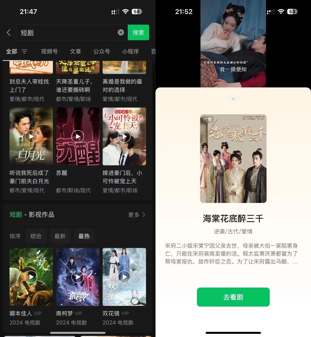 左图:微信搜一搜短剧页面 右图:视频号短剧页面
