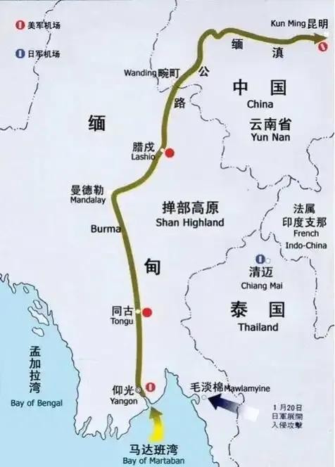 从靠近中国的方向往南依次为密支那、腊戍、曼德勒、仁安羌、同古和仰光。仰光地处缅甸最南端,此前所有支援物资均先通过船只运至仰光港口卸货,再经滇缅公路运往中国云南。然而,当日军逼近仰光时,驻守此地的英军竟不战而逃,英军总司令亚历山大轻易将仰光拱手让给日军。