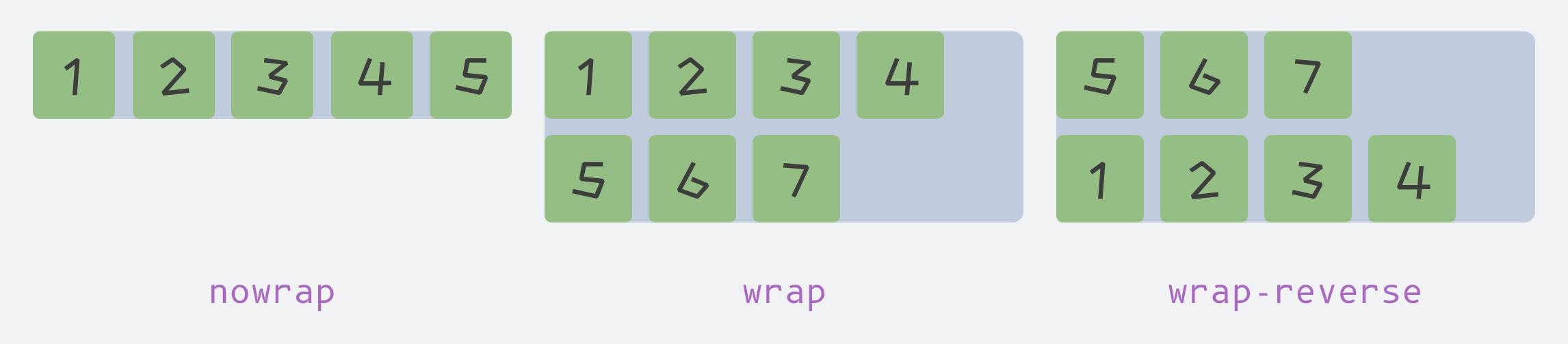 nowrap:(默认值)所有项目都在一行上排列,不换行wrap:项目在必要时换行,新行在下方wrap-reverse:项目在必要时换行,新行在上方