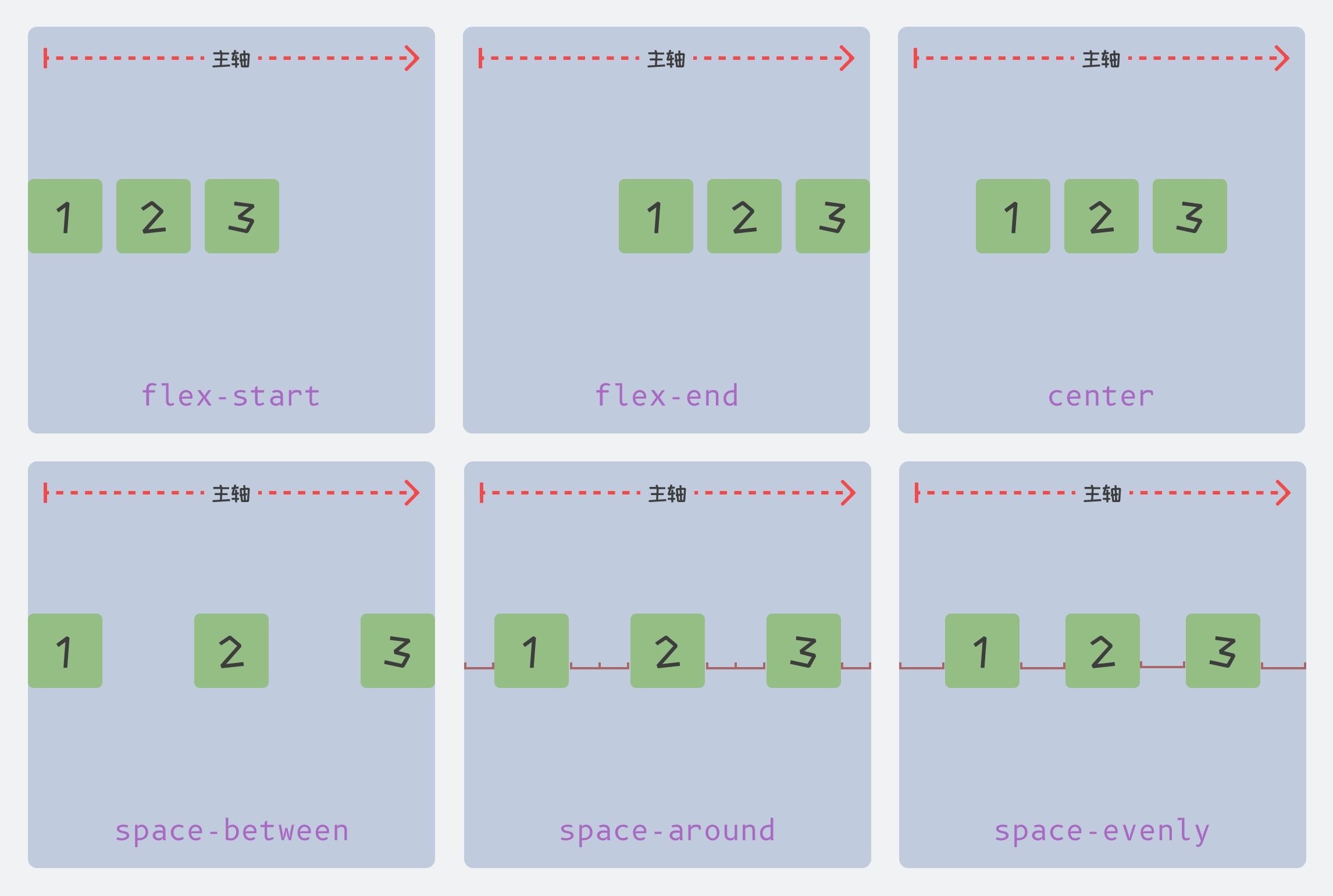 该属性主要决定项目在主轴上的对齐方式,可能值如下: