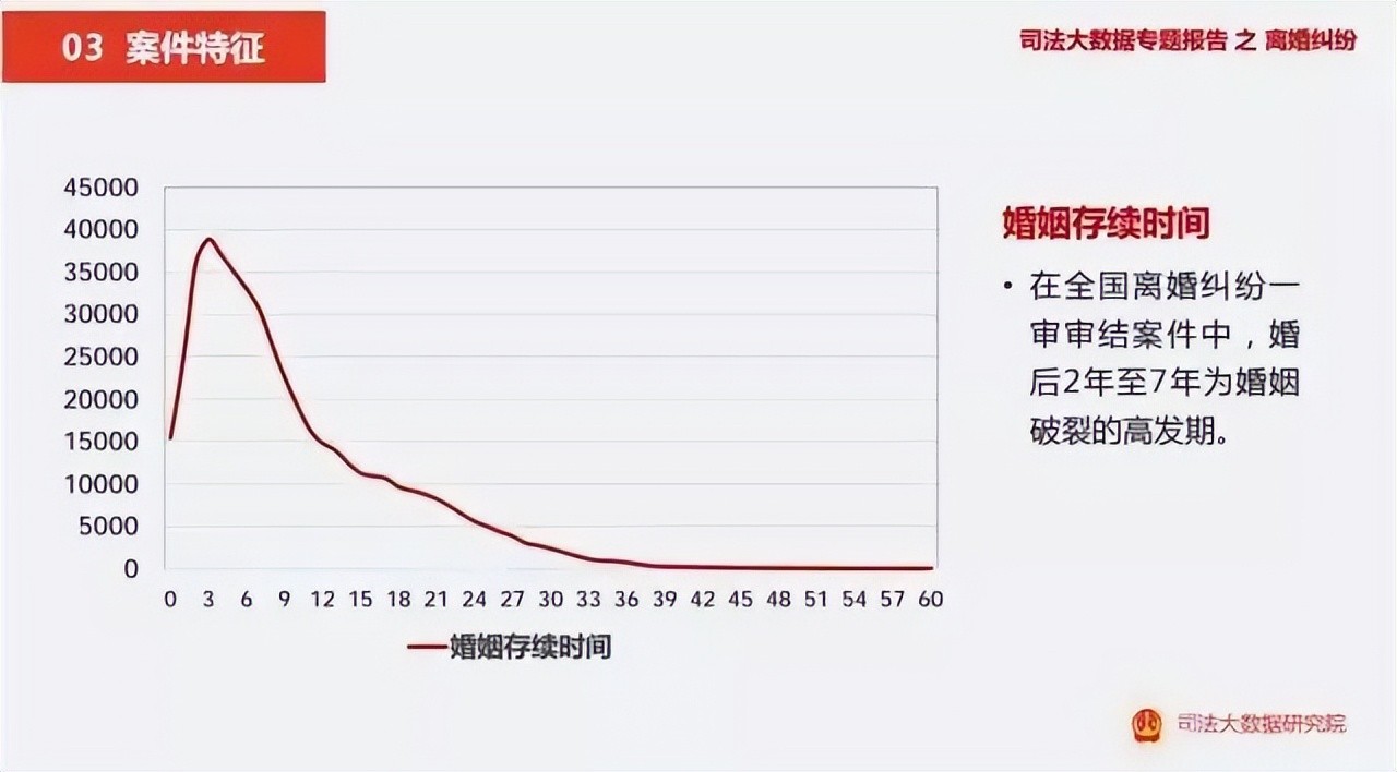 在全国离婚纠纷一审审结案件中,婚后2-7年是婚姻破裂的高发期,结婚3到5年达到了峰值。