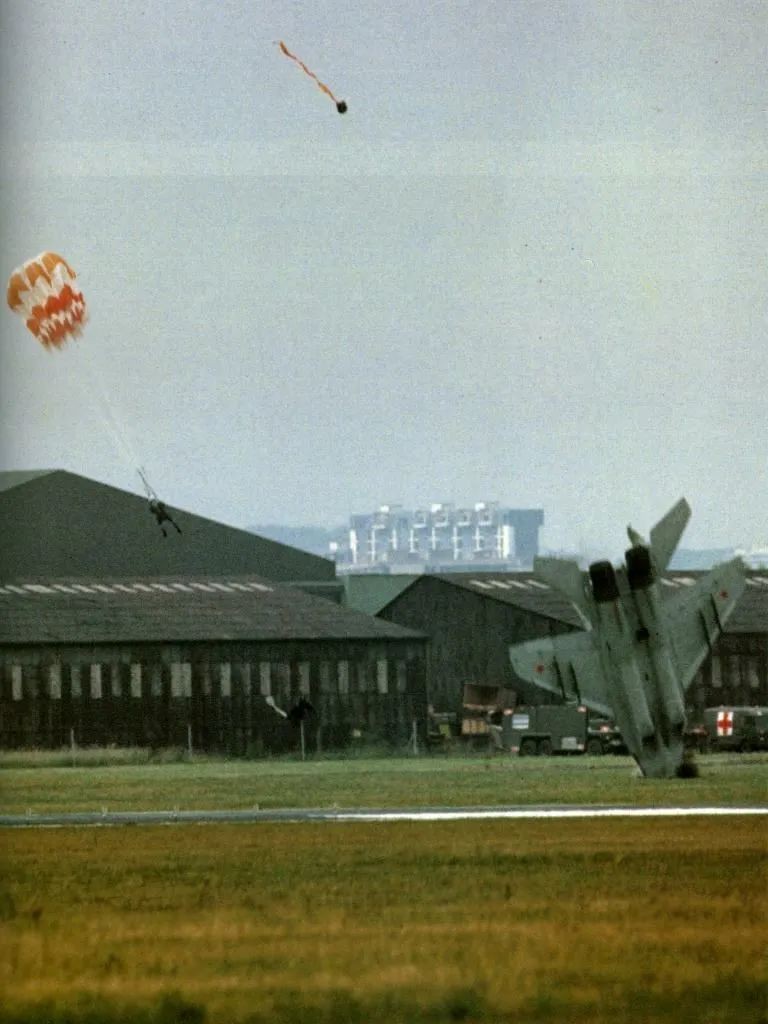 在13点45分01秒,米格-29已经处于机鼻垂直朝下的姿态,由于此时飞机的高度和速度极低,根本没有机会改出。即便在这样回天无力的态势下,科沃丘尔还是没有立即弹射,而是继续操纵飞机以确保米格-29不会冲向观众。