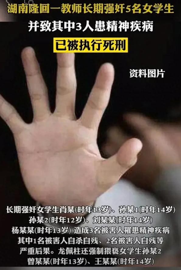 o 2018年10月,湖南一名小学班主任在一年多的时间内,将本班的多名不满12岁的女生,带到没有人的宿舍、澡堂,办公室,甚至带到校外,进行猥亵和强奸。该案被称为“现实版熔炉”,最终被判处无期徒刑。