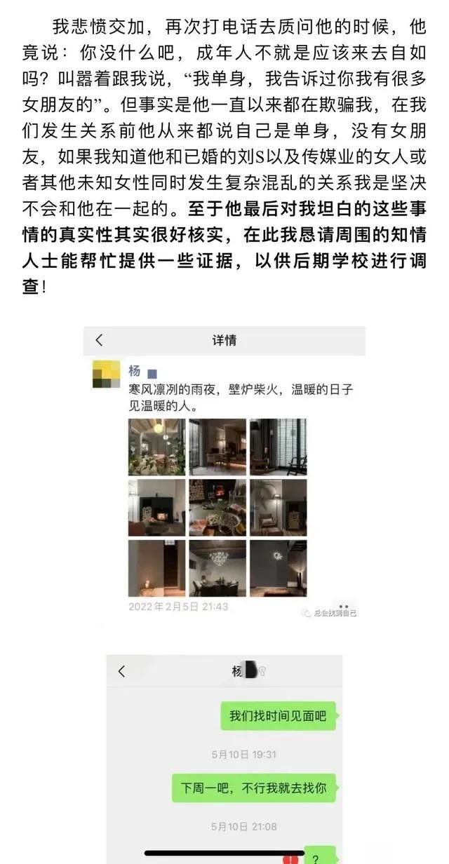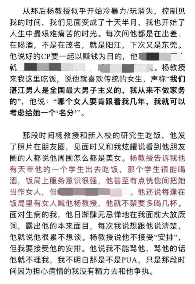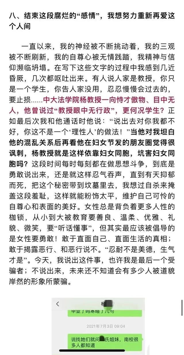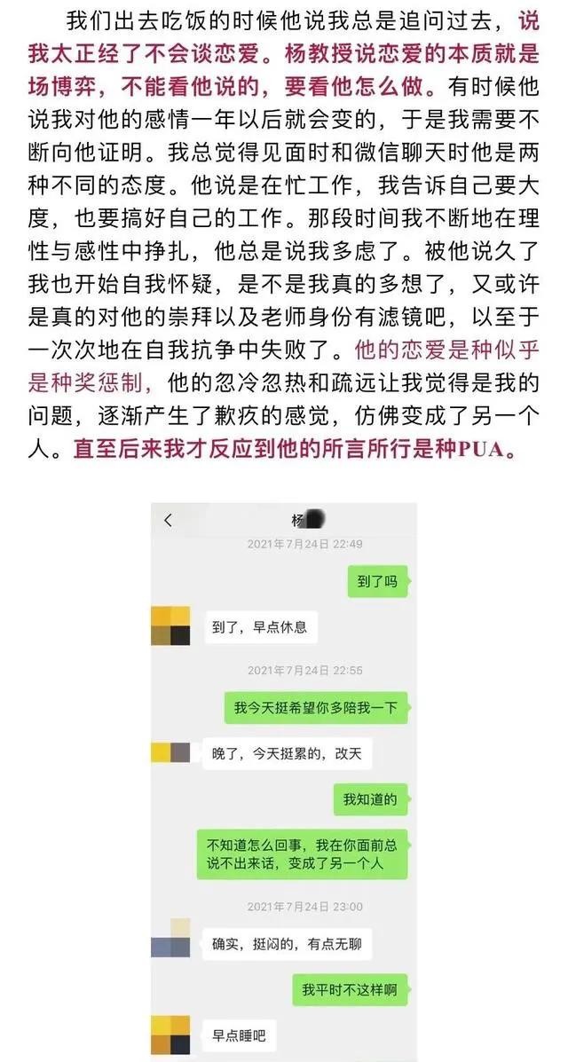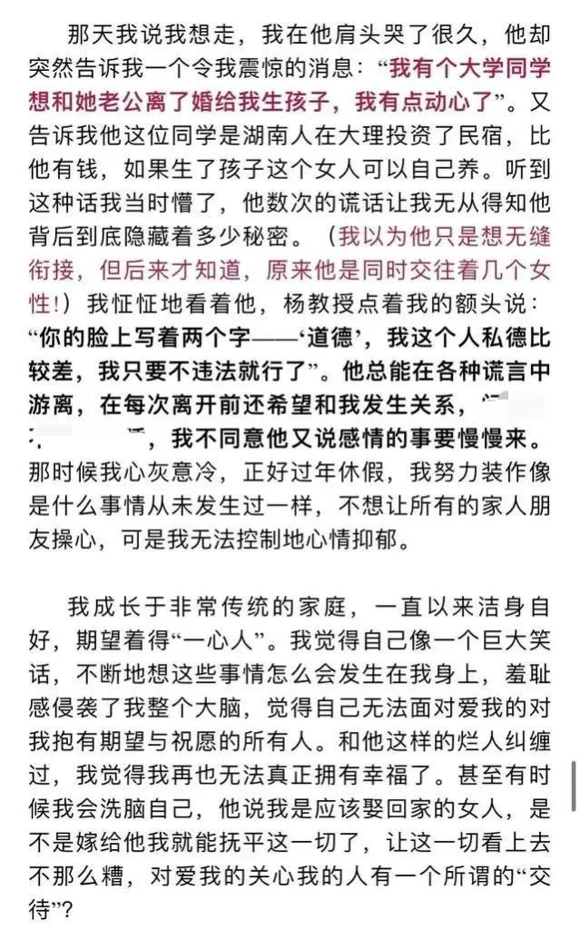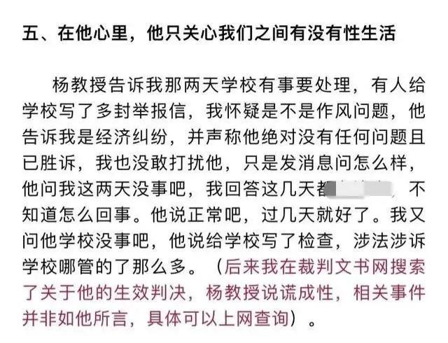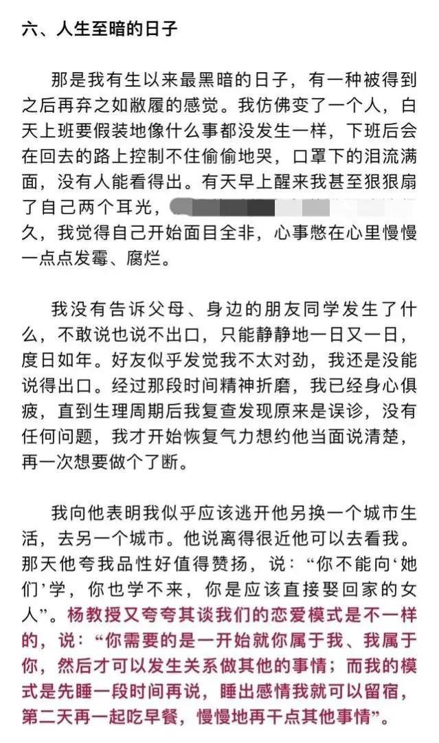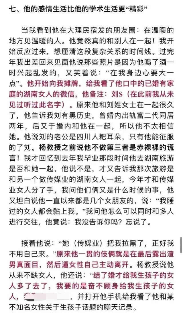在女生的举报信中,历数了杨教授的多项罪过,包括以恋爱为名与多名女性发生不正当关系,与他人发生婚外情等,字里行间看出这位女生的心在滴血,而杨教授的一些言论更是让人瞠目结舌,简直令人不堪入目。