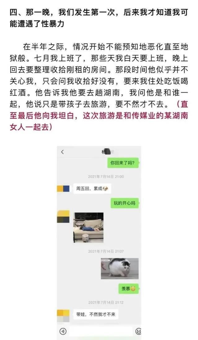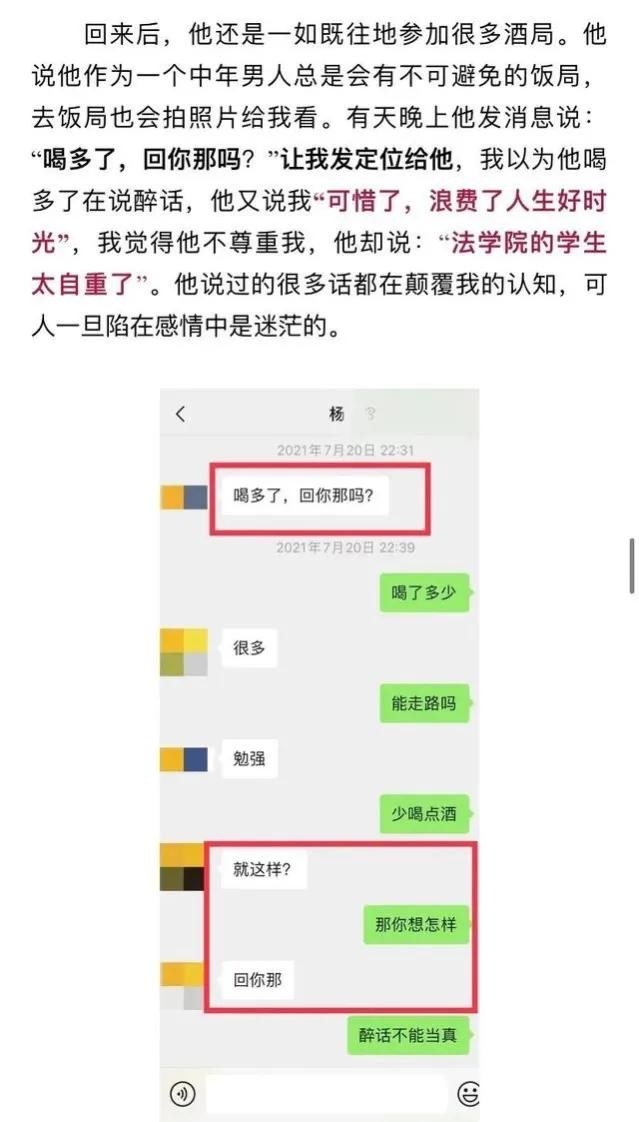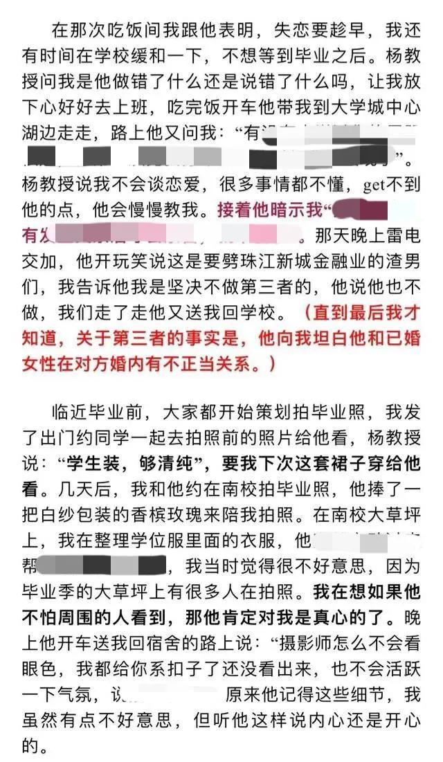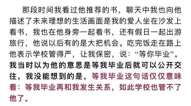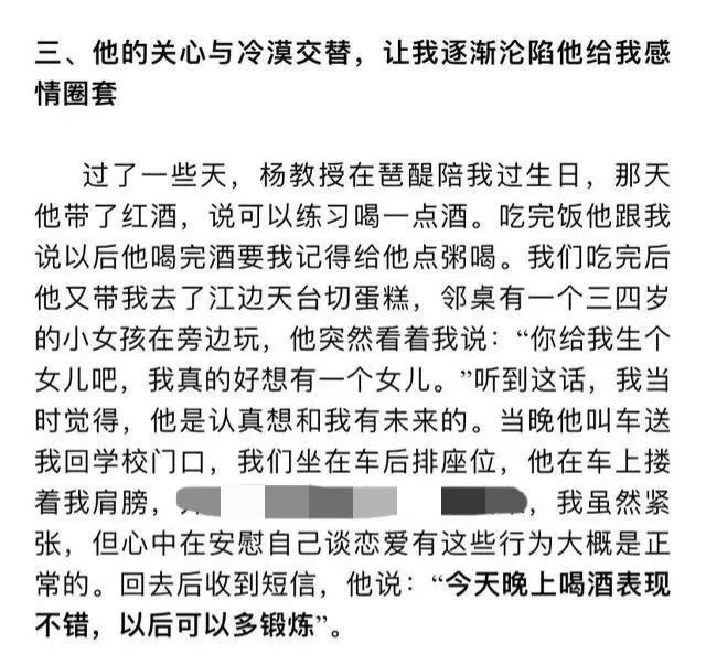 在女孩毕业工作后,也到了杨教授所说的“最佳时机”,他开始为发生关系,做各种的铺垫,甚至还说出了“法学院的学生太自重了”,这样大言不惭的话。