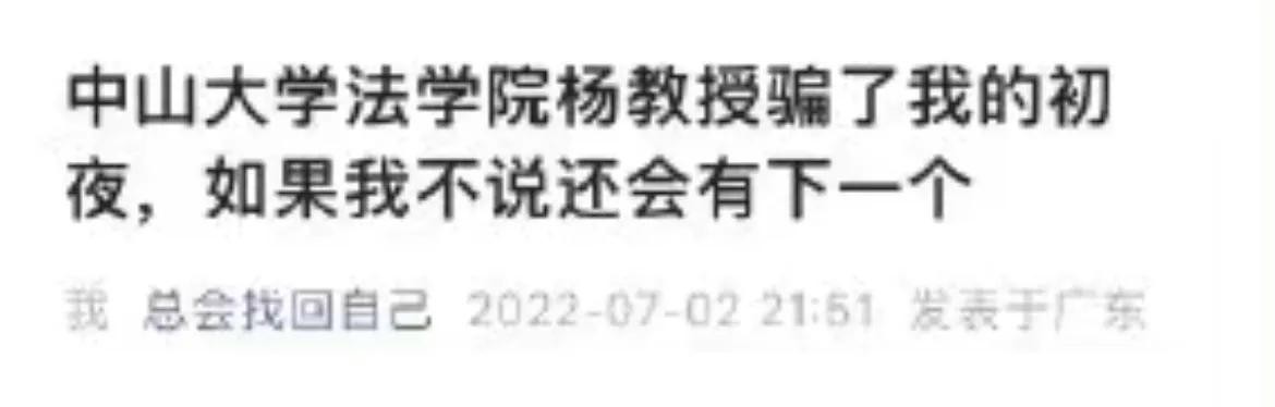 7月2日晚上,一篇万字举报信,在网络上引起了轩然大波,标题是《中山大学法学院杨教授骗了我的初夜,如果我不说还会有下一个》。