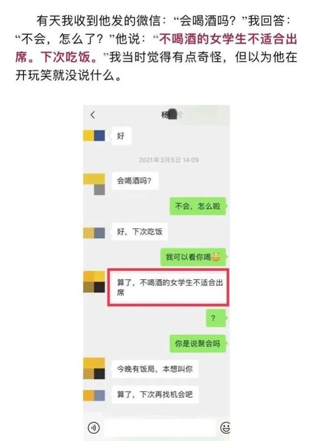 在这张聊天记录截图中,杨教授第一次邀请女孩喝酒,当得知女孩不会喝酒时,他竟然使用了欲擒故纵的手段,一来可以保持自己在女孩心目中的正直形象,二来也吊起了女孩的胃口。