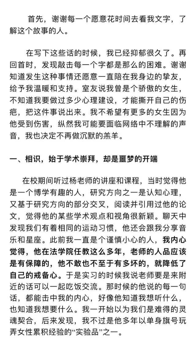 在举报信的开篇,就可以看出,因为杨教授的博学多才和人格魅力,女孩早已对杨教授仰慕已久, 再加上他“法学教授”的光环,让一个花季少女本该有的戒备心,也荡然无存了。