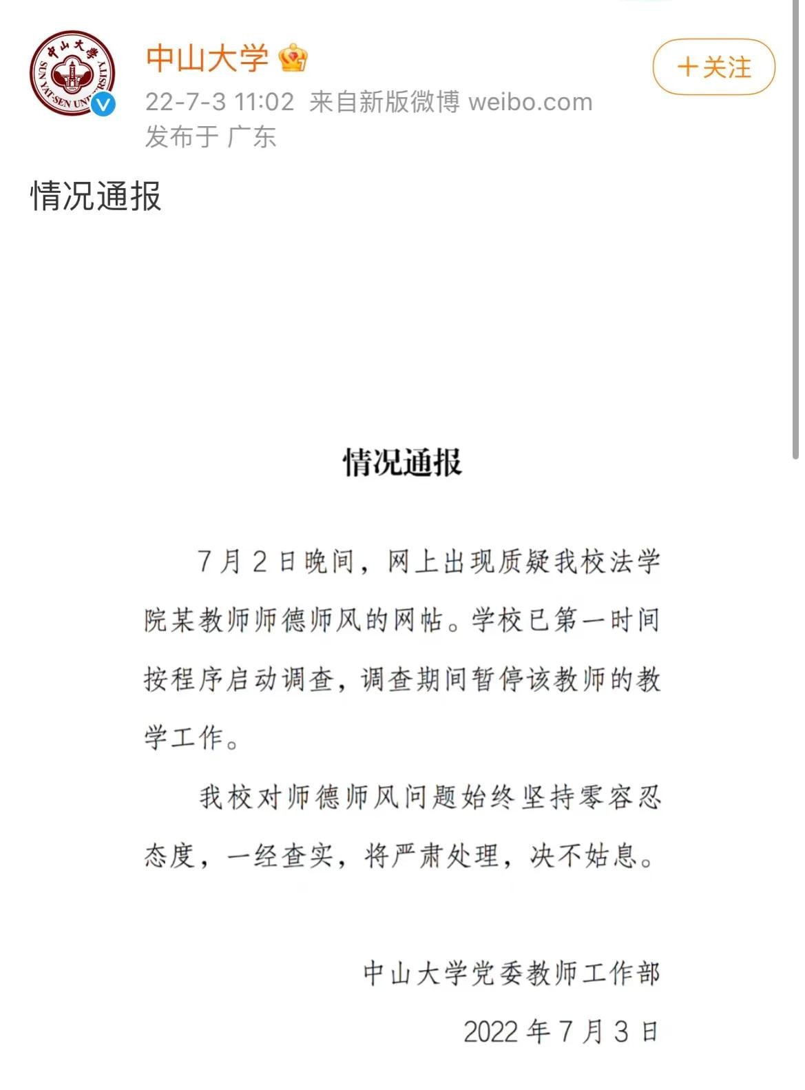 在7月3日,中山大学做出回应,“学校已第一时间按程序启动调查,调查期间暂停该教师的教学工作。我校对师德师风问题始终坚持零容忍态度,一经查实,将严肃处理,决不姑息。”