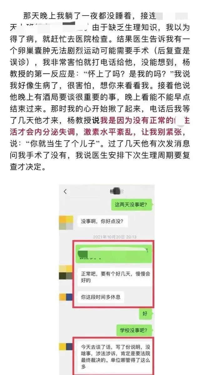 在发生关系之后,女孩的身体出现了一点问题,杨教授的第一反应是“怀上了吗?是我的吗?”