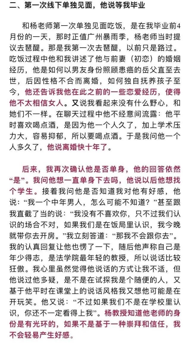 三、所谓的谈恋爱,从始至终都是见色起意。这位杨教授最终还是和这名女大学生发生关系,并且还说出很多大言不惭的话。我们很难想象这些话竟然都是来自于一位法学教授,一位知法懂法的人会说出这样的话。这是人品和师德的问题,欺骗女生感情诱导女生犯错误,这哪是教授该有的行为?