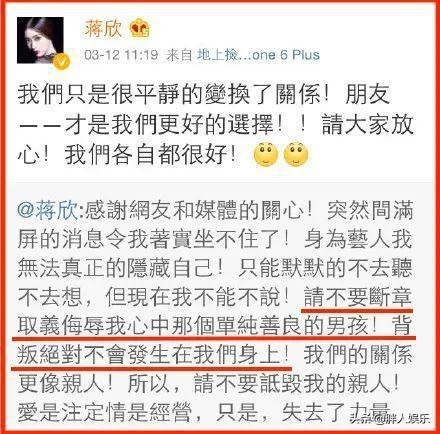 外界传闻叶祖新劈腿出轨,但在蒋欣看来,分手不出恶言,2015年,两人分手时,蒋欣的官宣文案是:我们只是很平静地换了关系,由恋人变成了朋友。还让外界不要侮辱自己心目中那个单纯善良的男孩。也算是非常大度了。