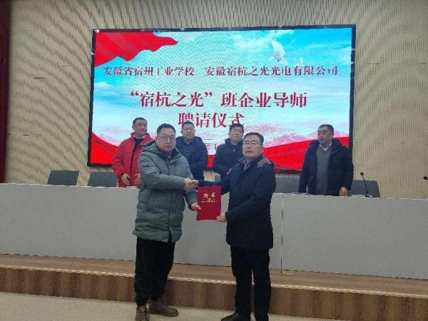 研讨会后,宿州工业学校聘任安徽宿杭之光光电有限公司副总经理曹金波为学校特聘企业导师,李炳南为特聘企业导师颁发聘书。