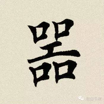 下部两个“口” 左低右高,稍抗肩。左“口”直对上面小“口”,略大于右上角的“口”,稍右斜,左竖稍轻,右竖稍重;右“口”直对上面小“口”,又要大于左“口”,平稳厚重,两个横折都为实接起笔,而右边的最实,注意最后一笔横画的收笔要稍下垂,以稳住整字。