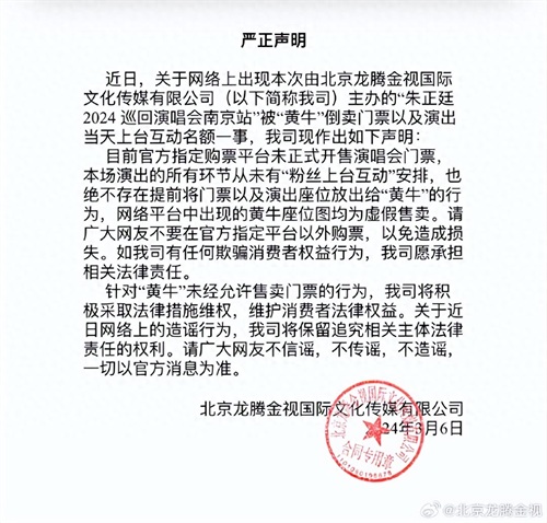 3月6日,北京龙腾金视国际文化传媒有限公司发布严正声明:近日,关于网络上出现本次由北京龙腾金视国际文化传媒有限公司(以下简称我司)主办的“朱正廷2024巡回演唱会南京站”被“黄牛”倒卖门票以及演出当天上台互动名额一事,我司现作出如下声明: