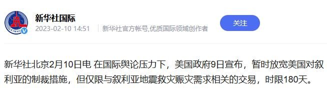 随着批评的声音越来越多,美国政府迫于压力不得不在2月9日宣布,暂时放宽对叙利亚的制裁,时限为180天。