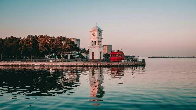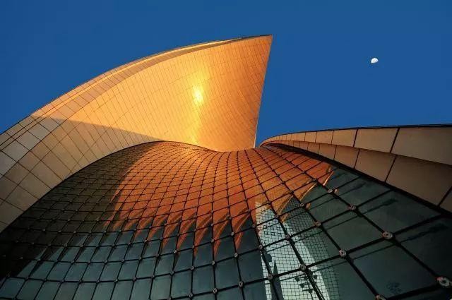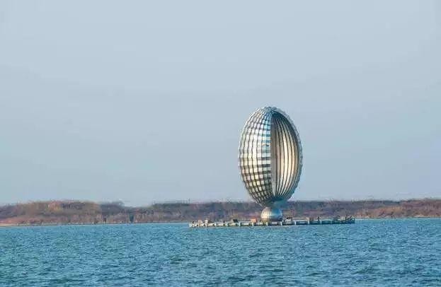 湖泊中央有标志性建筑物水滴,天空时不时会有飞机飞过。