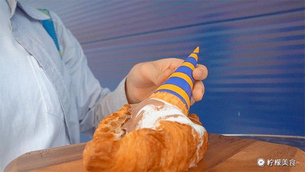 网传最红的【独角兽冰淇淋】就是它,可颂对半切开后,倒扣入冰淇淋就算完成,论颜值,给它100分不过分吧。