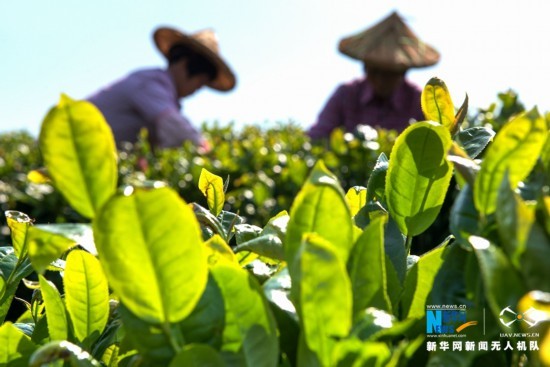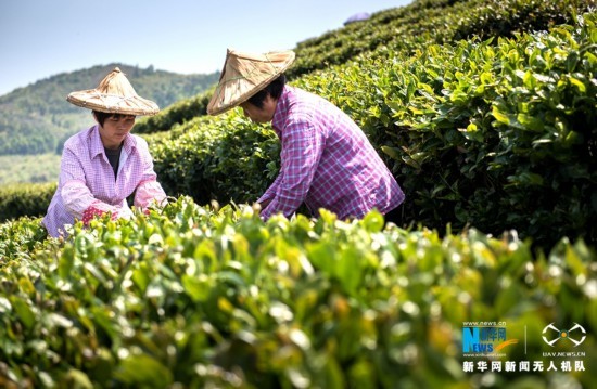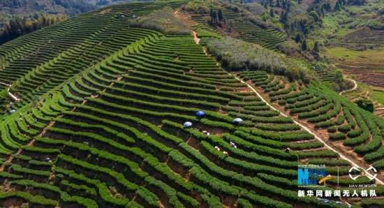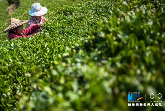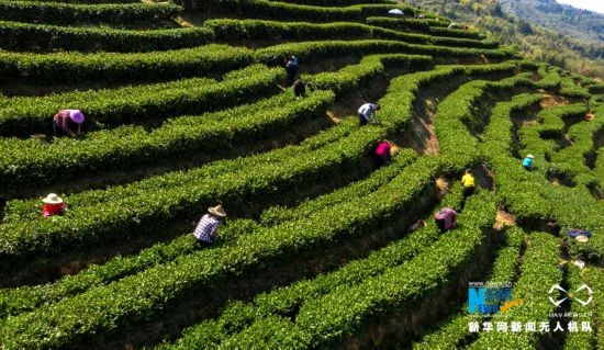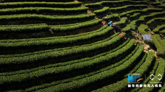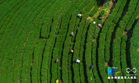 生态茶园美,茶农采茶忙(无人机拍摄)。新华网 王雄 摄 飞手 康庆平