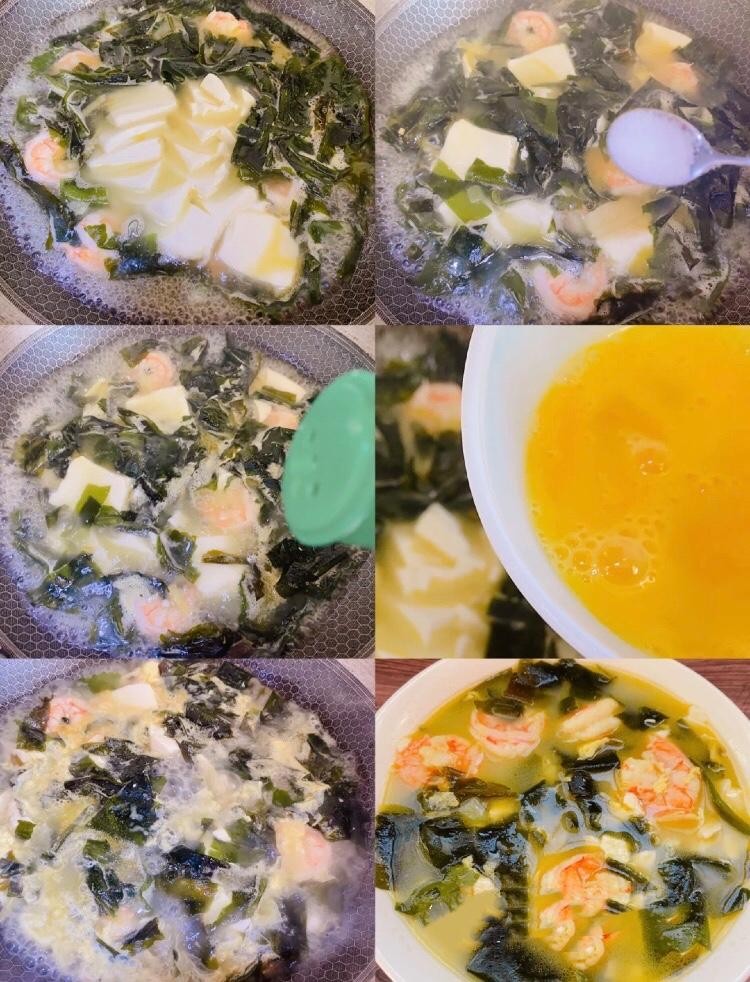 食材:裙带菜适量,大虾8只,嫩豆腐一盒,鸡蛋1个,小葱1棵,姜3片,盐适量,胡椒粉少许。1️⃣准备好所有食材,裙带菜清水泡发,大虾去壳去虾线洗净,鸡蛋打入碗中打散,豆腐切小块备用。