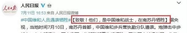 中国维和战士在南苏丹遇袭牺牲了,今天娱婆通过网络得知这个消息的时候,心里很难过。