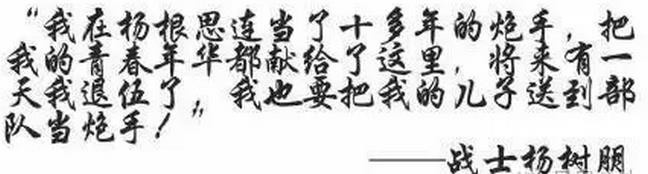 战友告诉导演组,杨树朋儿子刚出生时他说:“我在杨根思连当了十多年的炮手。把最美好的青春都留在了部队,将来有一天我儿子长大了,也要将他送到杨根思连来当炮手!”