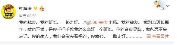 据悉,今年33岁的杨树朋是四级军士长,还曾在《真正男子汉》杨根思连中出镜,担任嘉宾们的教官。这两天,与他一起参加节目的袁弘、刘昊然、郭晓冬、杜海涛和王宝强等人均发文悼念。